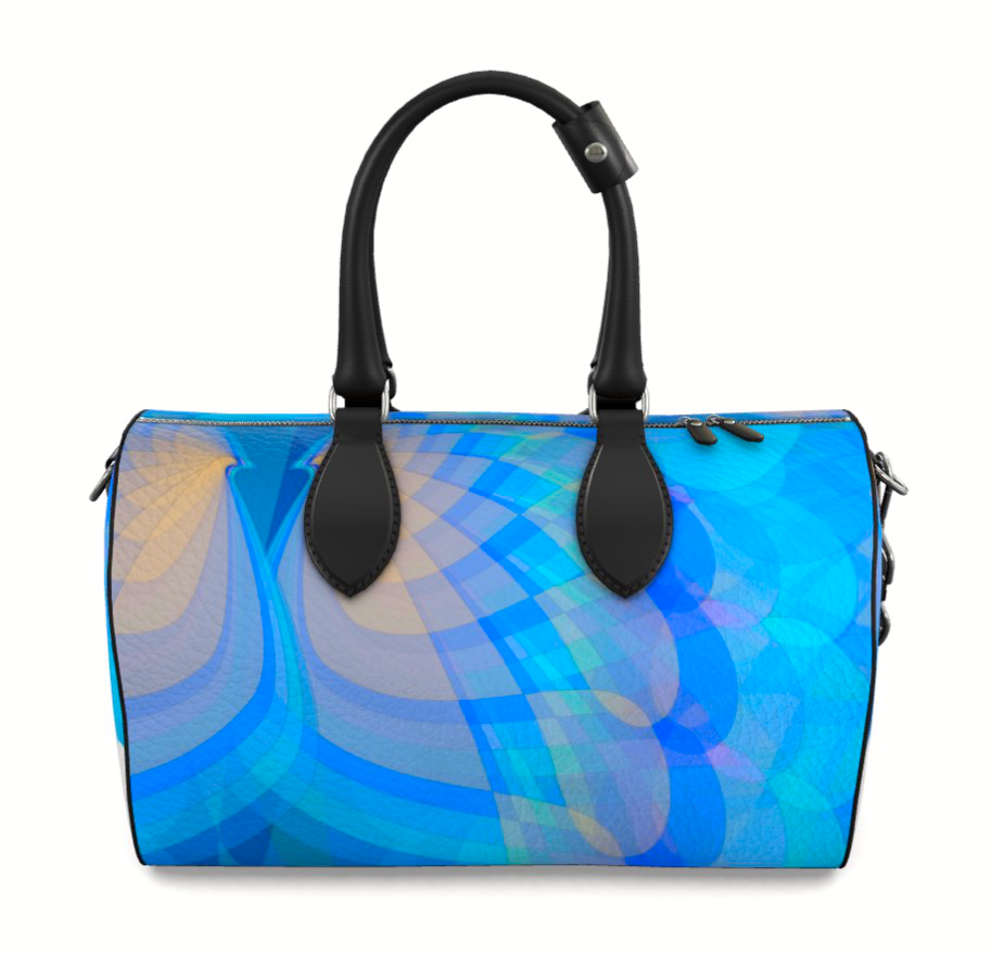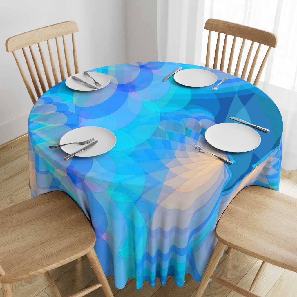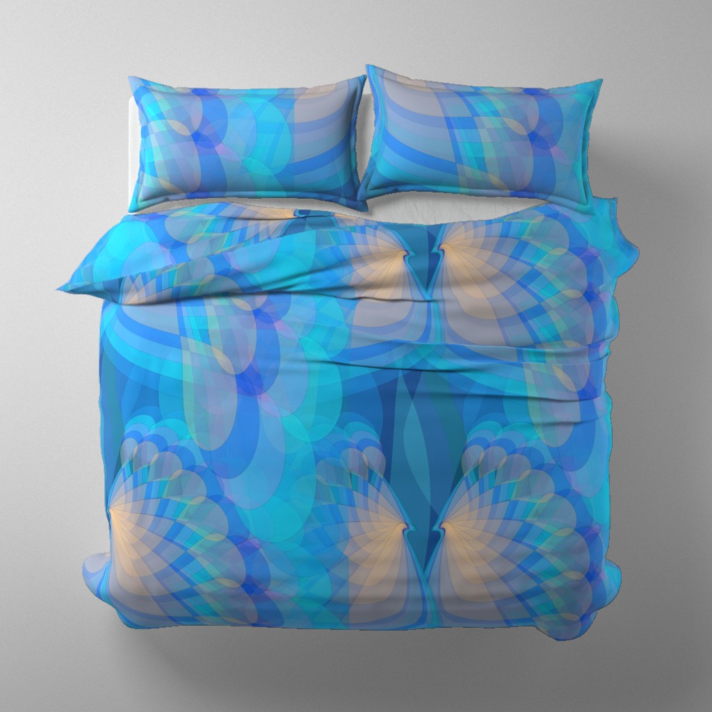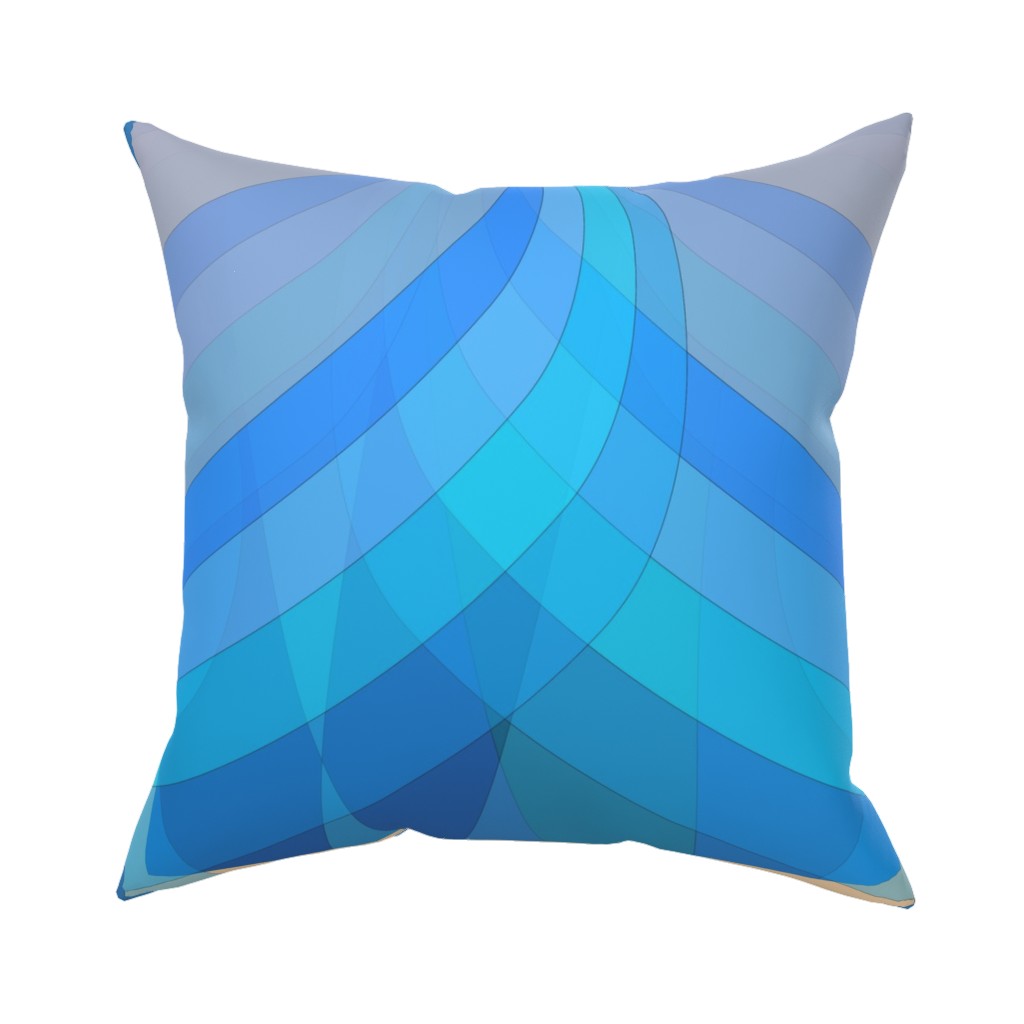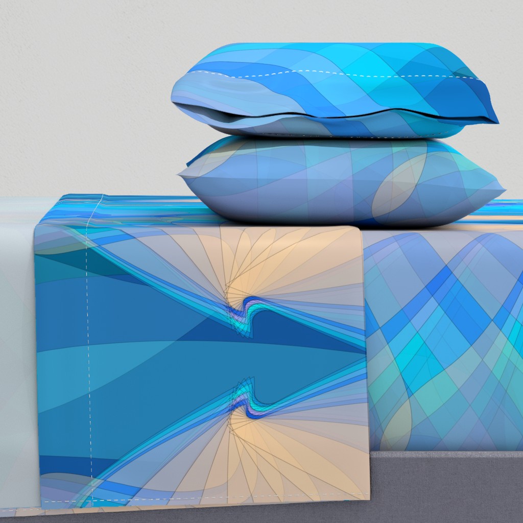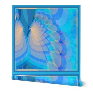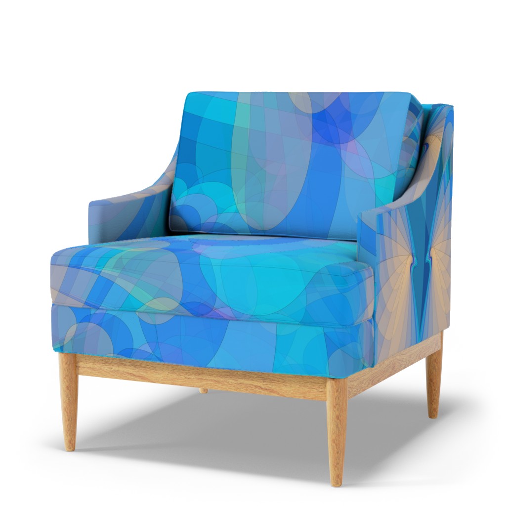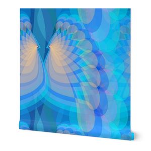 A bright geometric design, forms that subtly evoke the shape and sweep of peacocks. Layered curves and bold colors create a lively abstract composition with a rhythmic, almost feathered elegance.