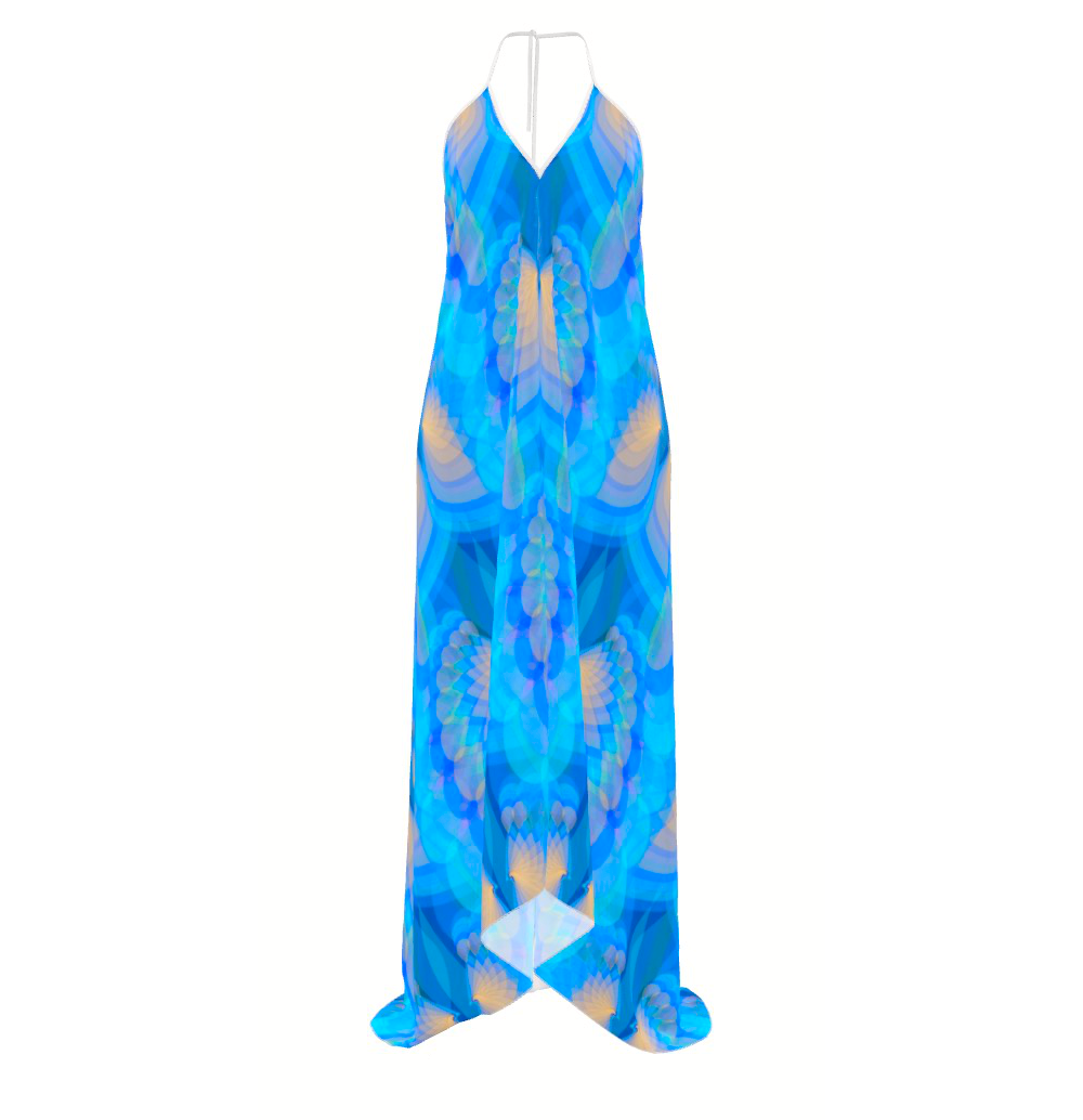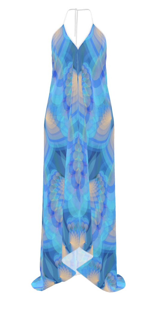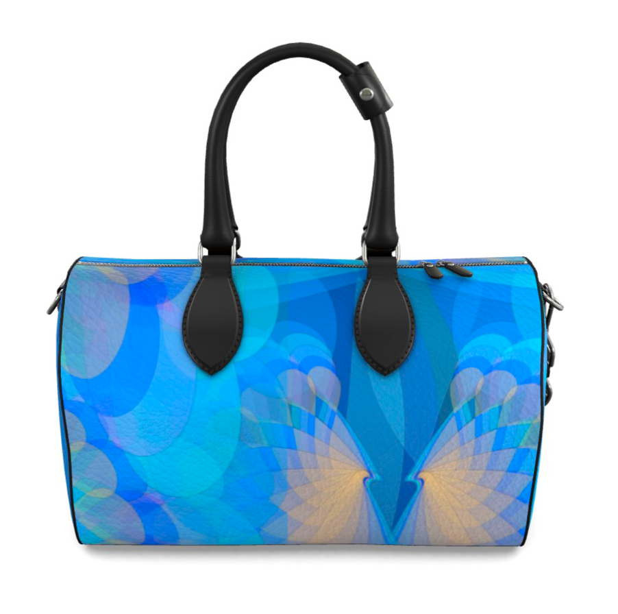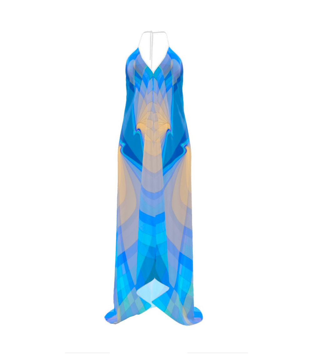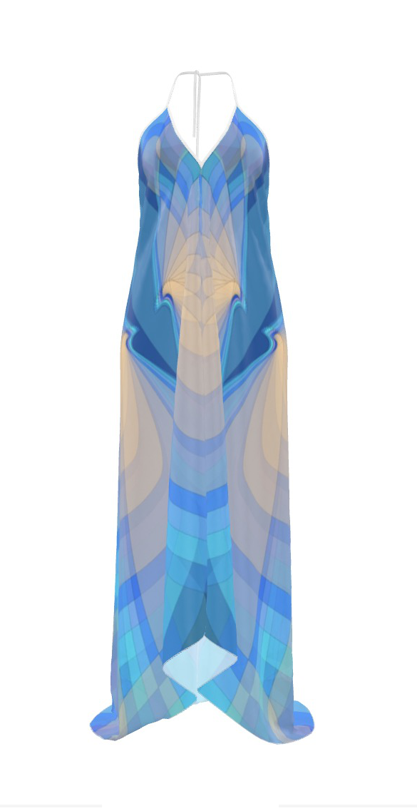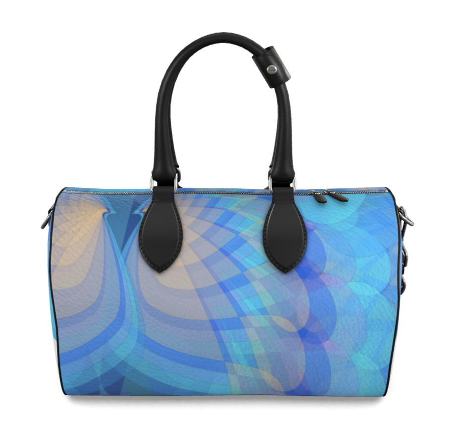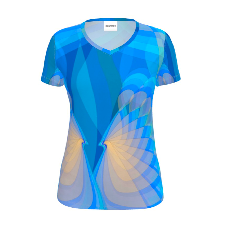 A bright geometric design, forms that subtly evoke the shape and sweep of peacocks. Layered curves and bold colors create a lively abstract composition with a rhythmic, almost feathered elegance.