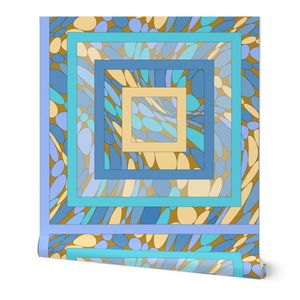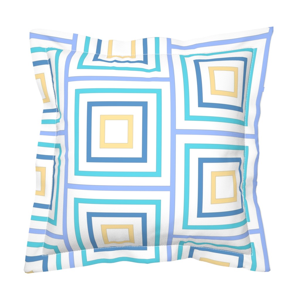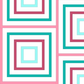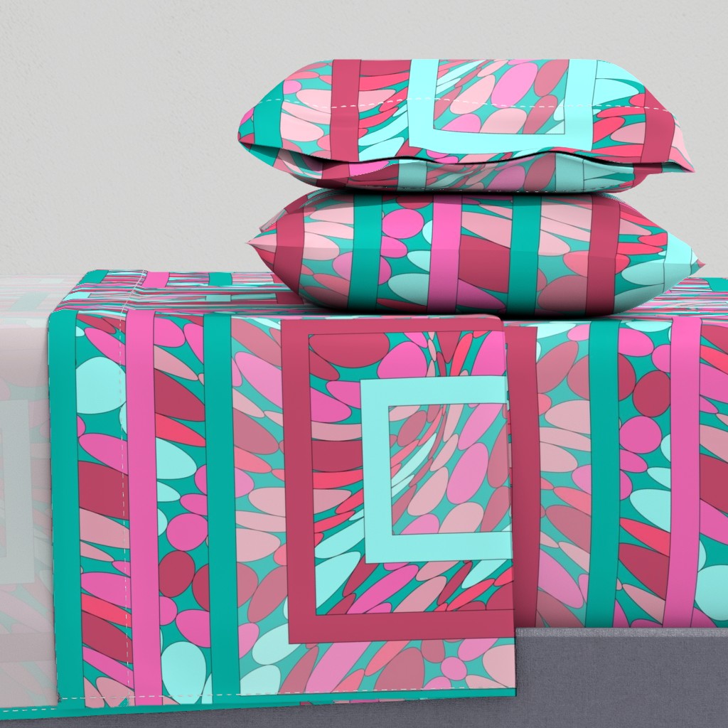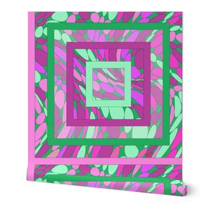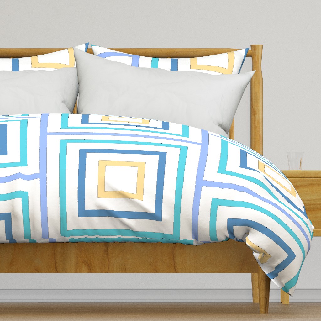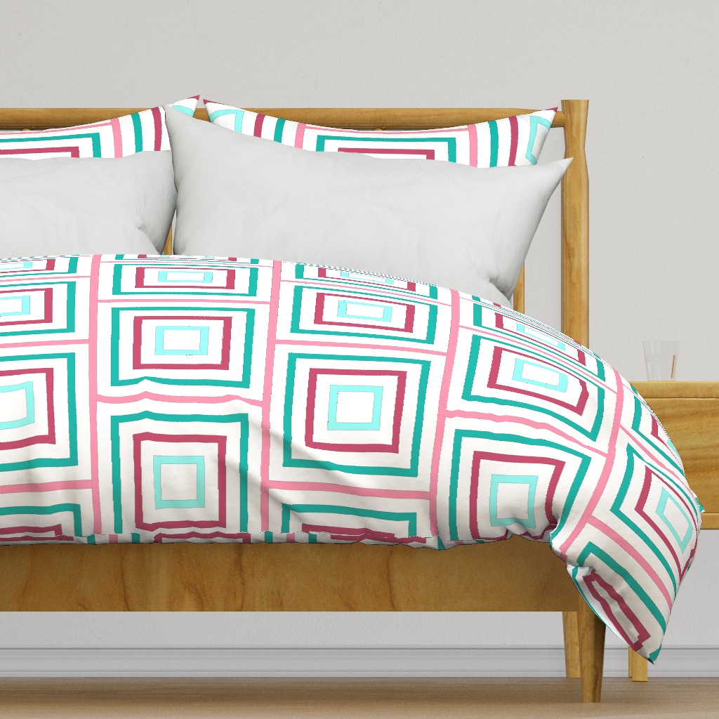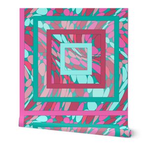 This geometric collection plays with squares inside squares in multiple colors and scales, with a unique version featuring pebble-like circles and ovals tucked within the forms. The mix of minimal and more intricate patterns allows endless pairing and contrast.