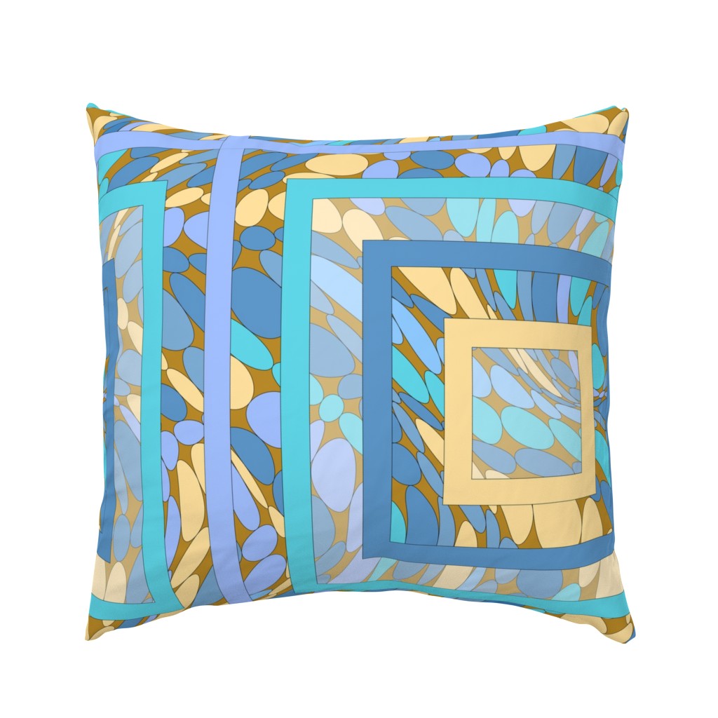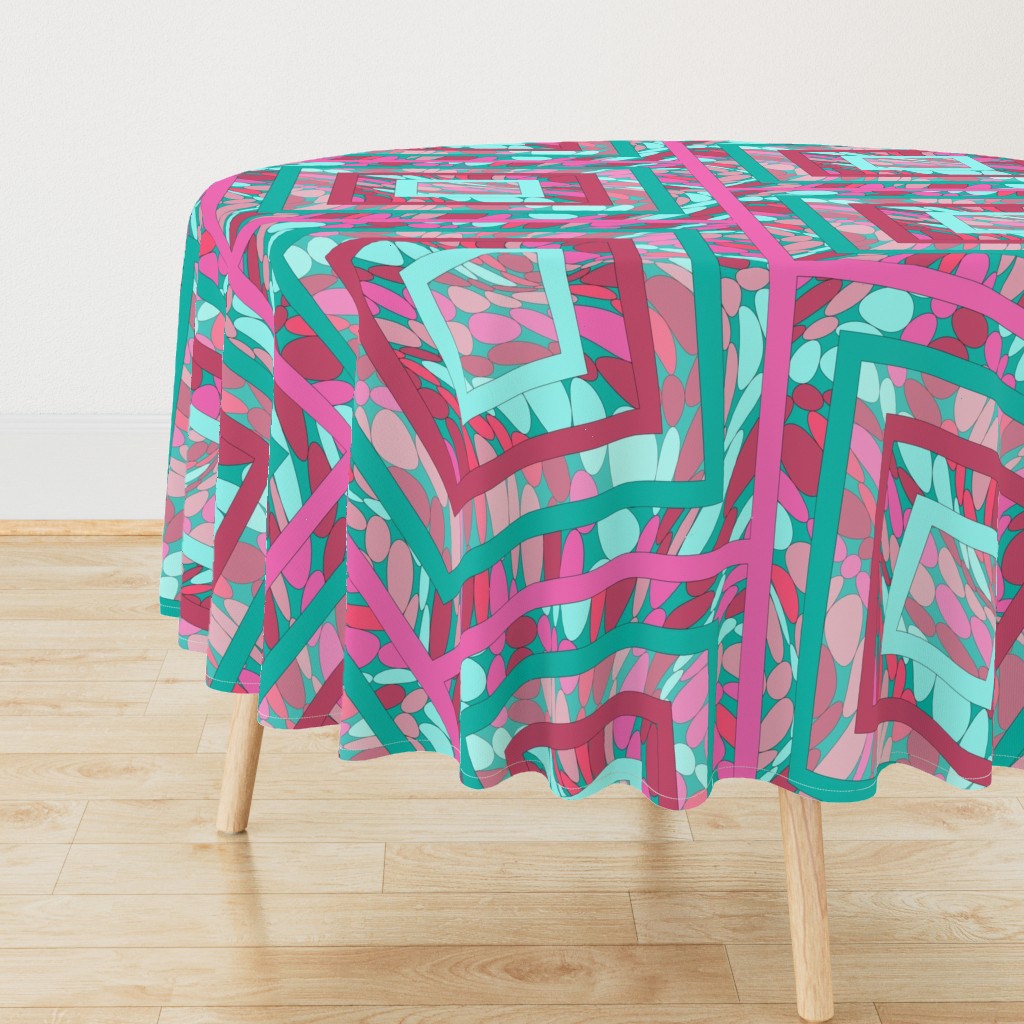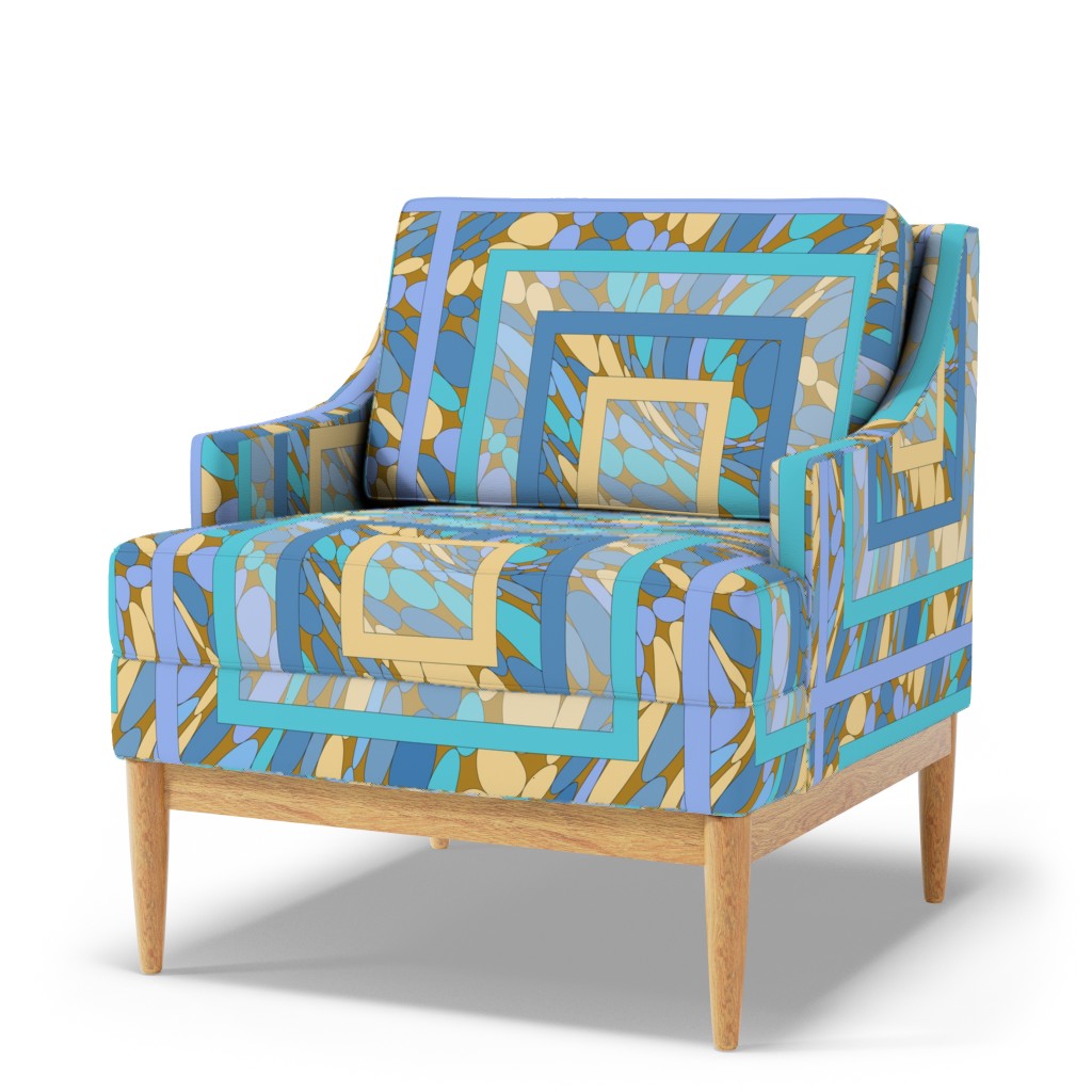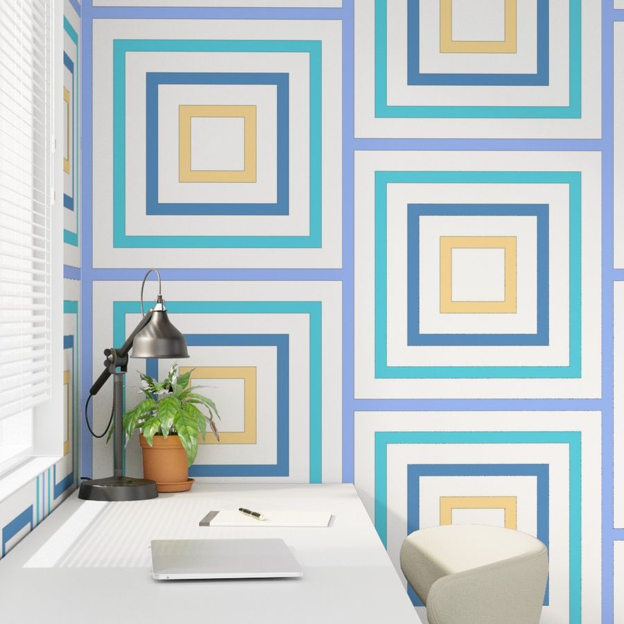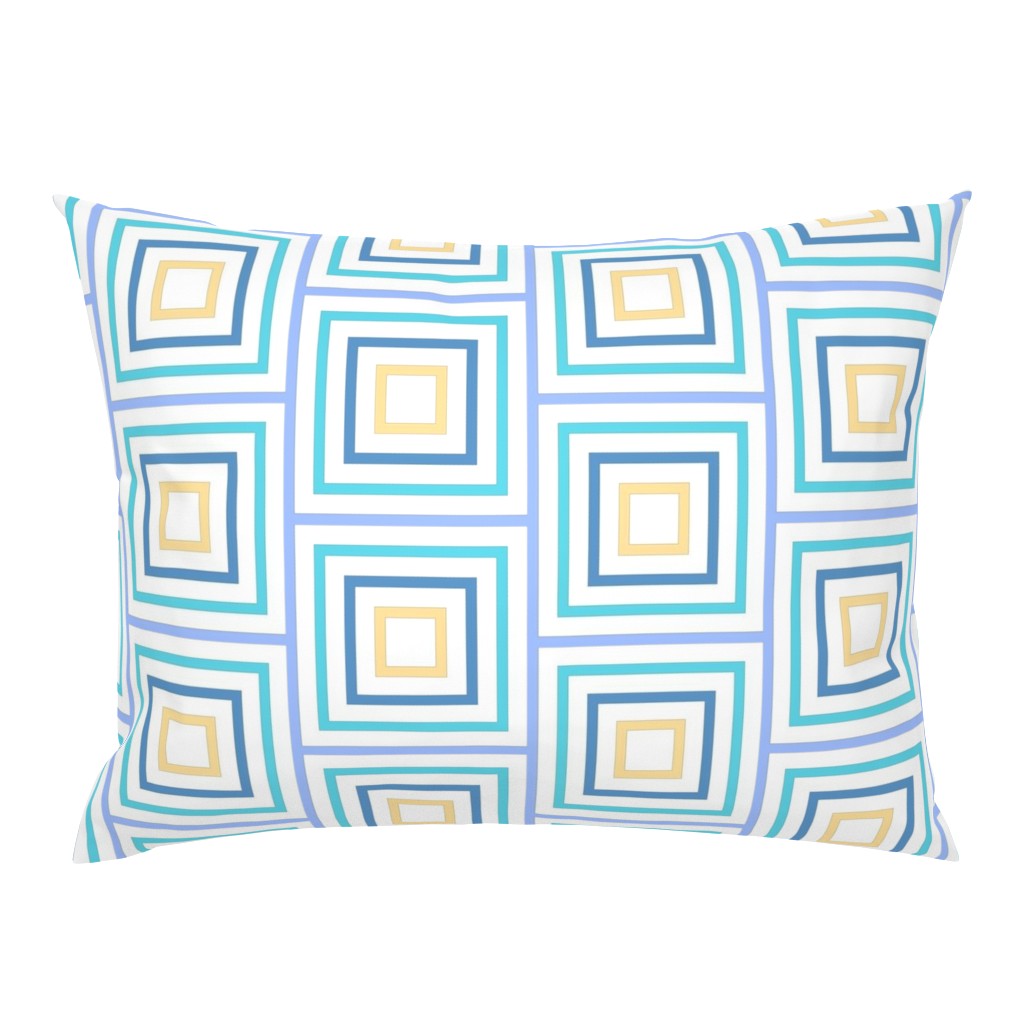 This geometric collection plays with squares inside squares in multiple colors and scales, with a unique version featuring pebble-like circles and ovals tucked within the forms. The mix of minimal and more intricate patterns allows endless pairing and contrast.